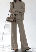 Meenew Women’s High Neck 2 Piece Sweatsuit Long Sleeve Knit Sweater Tops Wide Leg Pants Set Outfits